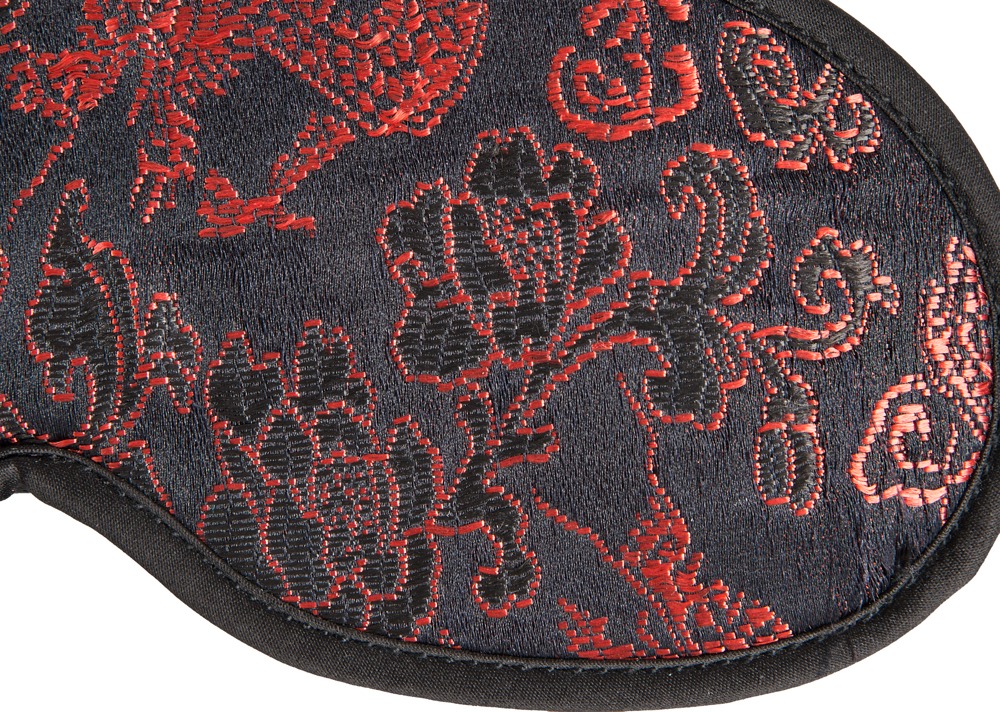 con manette chiusura a velcro, mascherina per gli occhi e frusta ( lunghezza totale 38 cm).Stile asia con motivi in tessuto rosso .